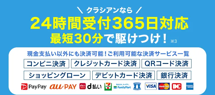 安すぎる価格表示にはご注意下さい!安すぎる価格を表示している業者の中には、本来かかる料金が含まれていない場合が多く、基本料金のみを表示して作業料金が含まれていない可能性があります。クラシアンは安心安全の明瞭会計!お見積りの金額にご納得いただいてから作業を行います!